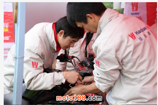他們對每一輛到服務(wù)站的摩托車都檢查得特別仔細。“再小的問題都不能大意。”從福建空降的陳天福說:“有些人覺得鏈條松是小事,能騎就好,但其實這是個安全隱患,鏈子太松,萬一在高速行駛過程中掉鏈子,后果是不堪設(shè)想的。”像陳師傅這樣的“金牌維修師”,一個梧州服務(wù)站便投入了6名,分別來自于河南、山西、廣東等地。