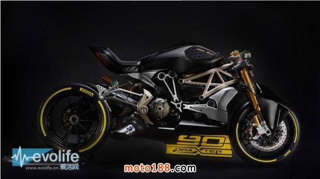 在Ducati DraXter側(cè)面印有90字樣,同時(shí)車尾攜帶了X標(biāo)志。同時(shí)離合器也被換上了具有象征意義的干式離合器,沒有頭燈、儀表,完全是想讓人跳出枯燥的參數(shù)本身,用身體感受速度的味道。