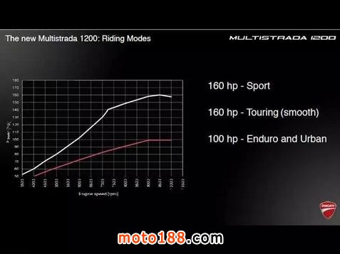 MTS 1200 S版車型裝備的5英寸全彩色液晶儀表有多種顯示模式,依照不同的騎行模式而不同,也可以由騎手自行選擇顯示模式。同時,顯示屏亮度也可以隨環(huán)境變化而自動調(diào)節(jié)。顯示模式共分四種:“運動”和“旅行”模式下,信息顯示得最全,“運動”模式下,發(fā)動機轉(zhuǎn)速顯示和Panigale上的一樣。在“城市”模式下,只顯示關鍵信息,以避免分散騎手的注意力。在“拉力”模式下,則增加了發(fā)動機轉(zhuǎn)速顯示。