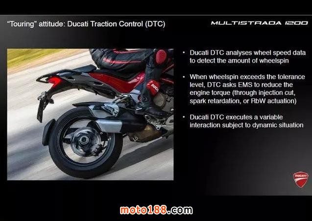 牽引力控制系統(tǒng)(DTC)共分8個等級,能有效防止后輪打滑,提升了操控性和主動安全性。當感應到后輪打滑時,這套系統(tǒng)會通過延遲發(fā)動機點火的方式,最多降低60%的動力輸出。如果還需要降低更多動力,系統(tǒng)就會切斷發(fā)動機的燃油供應。不同騎行模式下,DTC會采用不同的等級。當然,還能夠按照騎手的要求進行個性化設置。