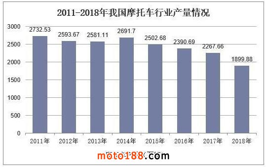中國摩托車市場,受到城市禁限摩政策和國Ⅳ排放標準的實施以及汽車產業快速發展的替代等影響,摩托車產量及需求量均逐年下降。2012年以來,中國摩托車產業發展面臨國內和國際諸多不利因素的影響,國內市場下行態勢難以扭轉,彎梁和騎式車下降幅度較大,摩托車年產量從2011年的2732.53萬輛下滑至2018年的1899.88萬輛,同比減少了832.65萬輛。