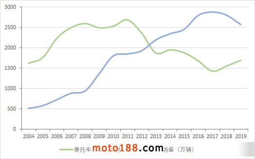 隨著禁行措施的出臺以及汽車工業的發展,在2011年全國銷量達到2692萬輛之后,摩托車銷量一路走低,到2017年一度跌破1500萬輛。