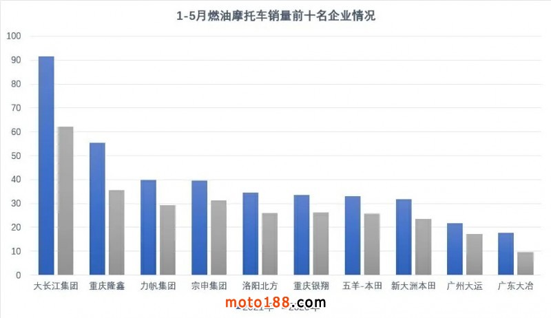 1-5月,燃油摩托車銷售前十名企業(集團)為大長江、隆鑫、力帆、宗申、洛陽北方、銀翔、五羊-本田、新大洲本田、廣州大運和廣東大冶分別銷售91.53萬輛、55.32萬輛、39.92萬輛、39.45萬輛、34.6萬輛、33.5萬、32.95萬輛、31.81萬輛、21.75萬輛和17.81萬輛。