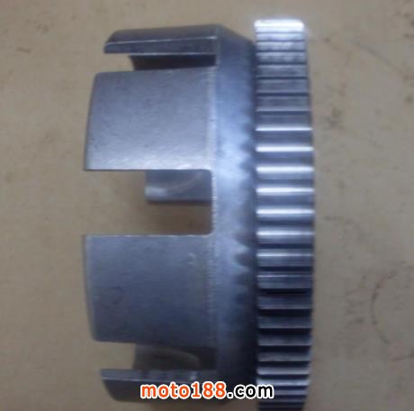 CL125-3春蘭虎摩托車是仿制本田CB125T的產(chǎn)品,該曲軸結(jié)構(gòu)中,如上面兩圖,曲軸右端面裝有高速齒輪,它與變速器連接的零件為裝在主軸右端面上的離合器主動(dòng)轂大齒輪,如下圖,其連接方式為內(nèi)孔花鍵連接。