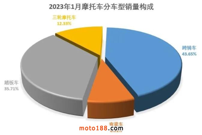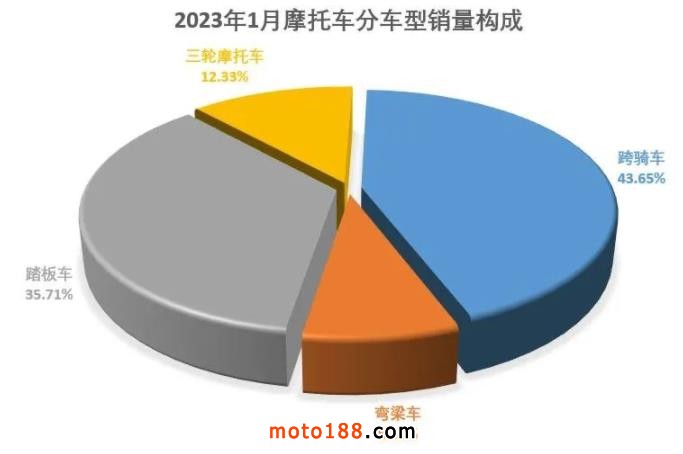 1月,從車型明細來看,三大車型中,跨騎車產銷41.2萬輛和45.42萬輛,產銷量環比下降32.21%和27.93%,同比下降42.52%和37.11%;踏板車產銷35.31萬輛和37.15萬輛(約50%為電動踏板車),產銷量環比下降51.34%和48.52%,同比下降31.19%和30.21%;彎梁車產銷8.55萬輛和8.65萬輛,產銷量環比下降30.46%和34.15%,同比下降27.91%和34.15%。
