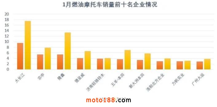 1月,燃油摩托車銷量前十名企業(集團)為大長江、宗申、隆鑫、重慶德呈威、輕騎鈴木、五羊-本田、新大洲本田、洛陽北方、廣州大運、力帆,分別銷售9.6萬輛、5.44萬輛、5.38萬輛、4.09萬輛、3.92萬輛、3.7萬輛、3.4萬輛、3.01萬輛、3萬輛和2.84萬輛。