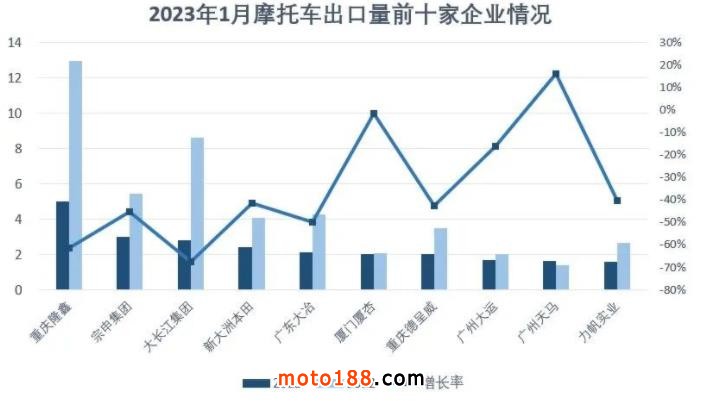1月,摩托車出口量排名前十位的企業依次為:隆鑫、宗申、大長江、新大洲本田、大冶、廈杏、重慶德呈威、大運、廣州天馬、力帆,上述十家企業共出口24.34萬輛,占摩托車出口總量的56.12%。