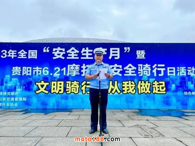 隨后,貴陽市公安交通管理局黨委委員、副局長俞翔發(fā)表講話并宣布成立貴陽市摩托車文明騎行勸導(dǎo)者隊伍,并向參會各機車俱樂部、車行、摩托車經(jīng)銷商負(fù)責(zé)人發(fā)放貴陽市摩托車文明騎行勸導(dǎo)志愿者袖標(biāo)。他表示,希望每一名摩托車騎行參與者都建立起守法的安全意識、規(guī)范的安全操作、文明的安全理念。做到有證上路、騎乘人員自覺佩戴頭盔、不酒駕毒駕、不改裝、不飆車、不超員、遵守交通信號指示、配合交通管理部門執(zhí)法、自覺抵制各類不文明交通行為等安全騎行摩托車的要求。緊接著,貴陽市精神文明辦“鞏文”指揮部督查組副組長魏宏宣布貴陽市摩托車文明騎行勸導(dǎo)者隊伍發(fā)車。
