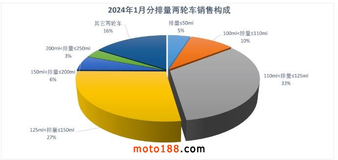 1月,50系列(排量≤50ml)產(chǎn)銷6.77萬輛和6.45萬輛,產(chǎn)銷量環(huán)比增長61.55%和73.74%,產(chǎn)銷量同比增長126.35%和92.45%;110系列(100ml<排量≤110ml)產(chǎn)銷12.88萬輛和12.78萬輛,產(chǎn)銷量環(huán)比下降2.32%和5.49%,同比增長42.44%和52.29%;125系列(110ml<排量≤125ml)產(chǎn)銷43.49萬輛和44.09萬輛,產(chǎn)銷量環(huán)比增長9.61%和23.27%,同比增長59.72%和51.42%;150系列(125ml<排量≤150ml)產(chǎn)銷36.05萬輛和36.52萬輛,產(chǎn)銷量環(huán)比增長28.18%和32.54%,同比增長107.57%和91.4%;200系列(150ml<排量≤200ml)產(chǎn)銷7.26萬輛和7.44萬輛,產(chǎn)銷量環(huán)比下降5.23%和7.46%,同比增長55.78%和45.58%;250系列(200ml<排量≤250ml)產(chǎn)銷4.56萬輛和4.34萬輛,產(chǎn)量環(huán)比增長2.75%,銷量環(huán)比下降1.88%,同比增長76.56%和42.67%;250ml以上排量(不含250cc)產(chǎn)產(chǎn)銷3.92萬輛和3.86萬輛,產(chǎn)銷量環(huán)比增長5.95%和8.12%,產(chǎn)銷量同比增長70.43%和55.69%。