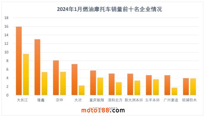 1月,燃油摩托車銷量前十名企業(yè)(集團(tuán))為大長江、隆鑫、宗申、廣東大冶、重慶銀翔、洛陽北方、新大洲本田、五羊-本田、廣州豪進(jìn)、輕騎鈴木,分別銷售15.94萬輛、13萬輛、8.09萬輛、7.23萬輛、5.74萬輛、5.03輛、5萬輛、4.65萬輛、4.643萬輛和3.95萬輛。