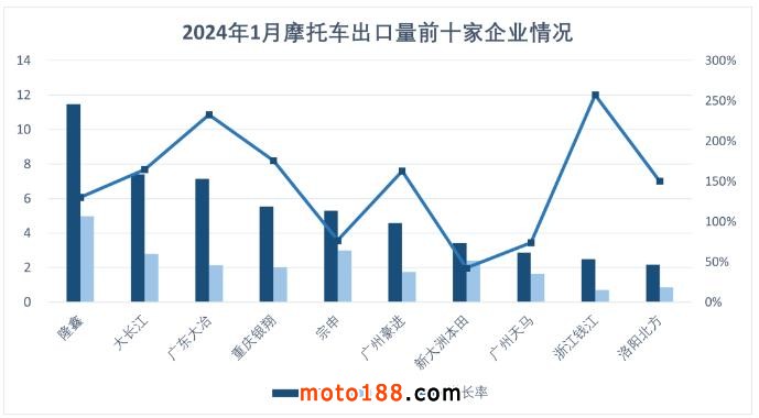1月,摩托車出口量排名前十位的企業(yè)依次為:隆鑫、大長江、廣東大冶、重慶銀翔、宗申、廣州豪進(jìn)、新大洲本田、廣州天馬、浙江錢江、洛陽北方,上述十家企業(yè)共出口52.41萬輛,占摩托車出口總量的60.17%。