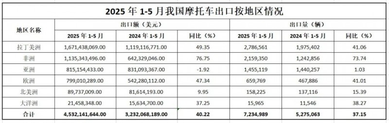 根據(jù)海關(guān)數(shù)據(jù)統(tǒng)計(jì)分析,2025年1-5月,我國摩托車整車出口量為723.50萬輛,較去年同期增長37.15%,出口額為45.32億美元,較去年同期增長40.22%。其中: