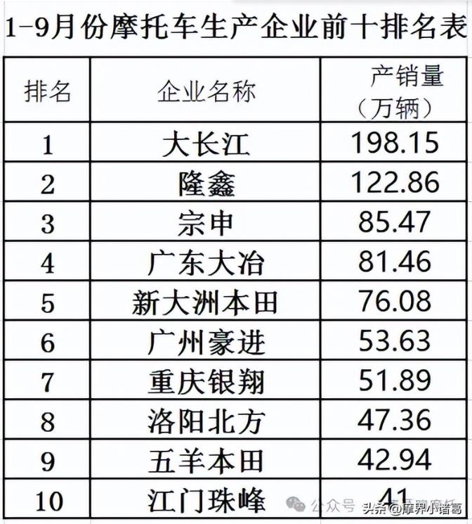 1-9月,燃油摩托車銷量前十名企業(集團)為大長江、隆鑫、宗申、廣東大冶、新大洲本田、廣州豪進、重慶銀翔、洛陽北方、五羊-本田、江門市珠峰。