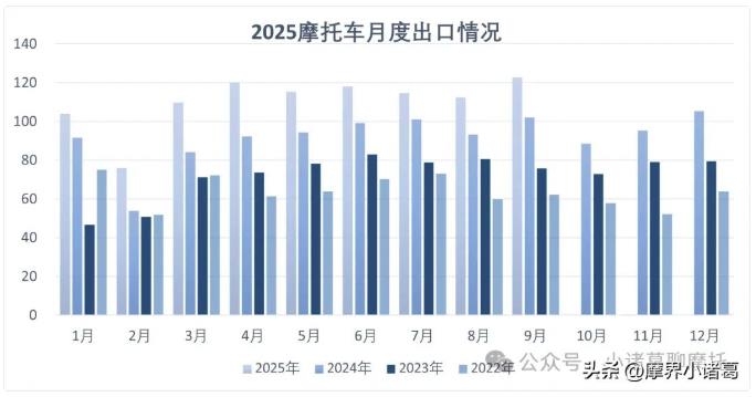 1-9月,摩托車生產企業產品出口總額81.36億美元,同比增長26.42%。整車出口量996.74萬輛,同比增長22.82%,出口金額65.96億美元,同比增長28.78%。摩托車發動機出口97.41萬臺,同比增長15.36%,出口金額1.94億美元,同比增長7.21%。