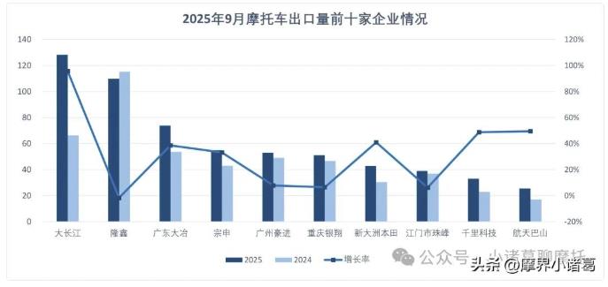 1-9月,摩托車出口量排名前十位的企業依次為:大長江、隆鑫、廣東大冶、宗申、廣州豪進、重慶銀翔、新大洲本田、江門市珠峰、重慶千里科技、航天巴山,上述十家企業共出口611.55萬輛,占摩托車出口總量的61.36%。