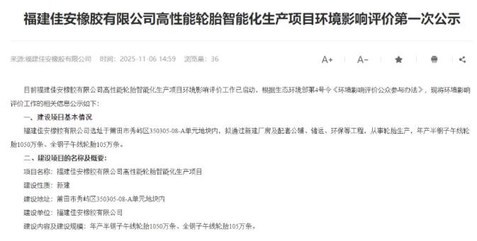 11月6日,一則來自福建莆田市秀嶼區的環評公示,揭開了輪胎行業又一重大投資布局的序幕。福建佳安橡膠有限公司擬投建“高性能輪胎智能化生產項目”,規劃年產能高達1155萬條。值得關注的是,該項目背后站著的是實力雄厚的輪胎巨頭——佳通輪胎。