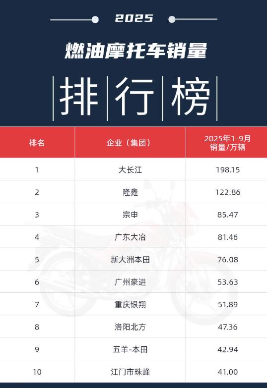 在燃油摩托車市場的增長中,頭部企業(yè)發(fā)揮了關鍵作用。2025年1-9月,大長江、隆鑫和宗申位列銷量前三甲,其中大長江集團以198.15萬輛的累計銷量穩(wěn)居榜首。生產(chǎn)的豪爵和SUZUKI兩大品牌摩托車,不僅暢銷國內,而且出口到80多個國家和地區(qū)。其燃油摩托車銷量,已經(jīng)連續(xù)22年全國排第一。