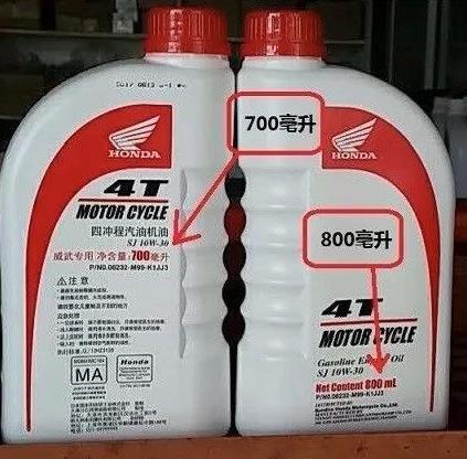 現(xiàn)在的摩托車機油量都不同,同是125排量的摩托車,有加900ml機油的,有加800ml的,有加700ml的,還有加550ml的。但市面上的摩托車機油包裝大多數(shù)都是1L裝的,如果你全加進去,就是加多了,容易導(dǎo)致車輛無力,油耗增加,曲軸油封漏油等故障。
