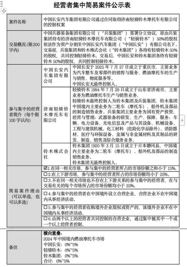 此后,中國長安在2025年12月完成了對濟南輕騎摩托車有限公司的100%股權收購,并在2026年3月通過資產劃轉取得濟南輕騎鈴木50%股權,與日本鈴木株式會社共同控制該公司。