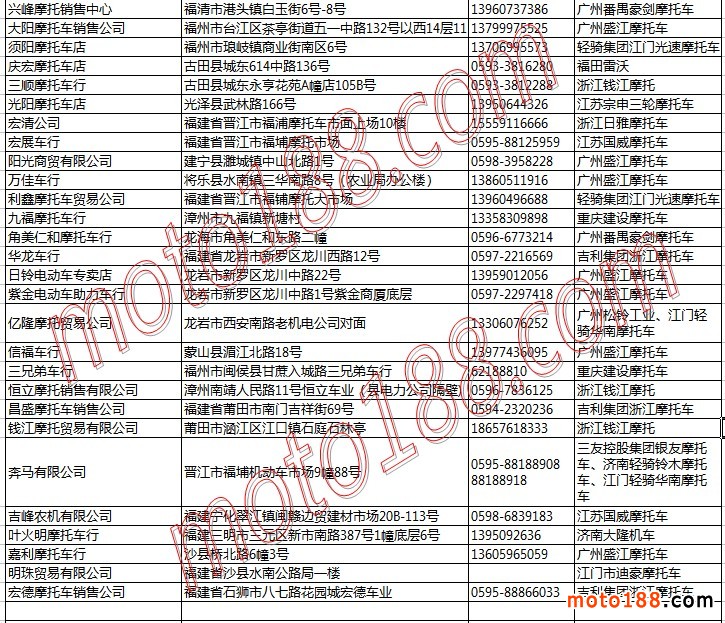 福建省摩托車整車經(jīng)銷商名錄