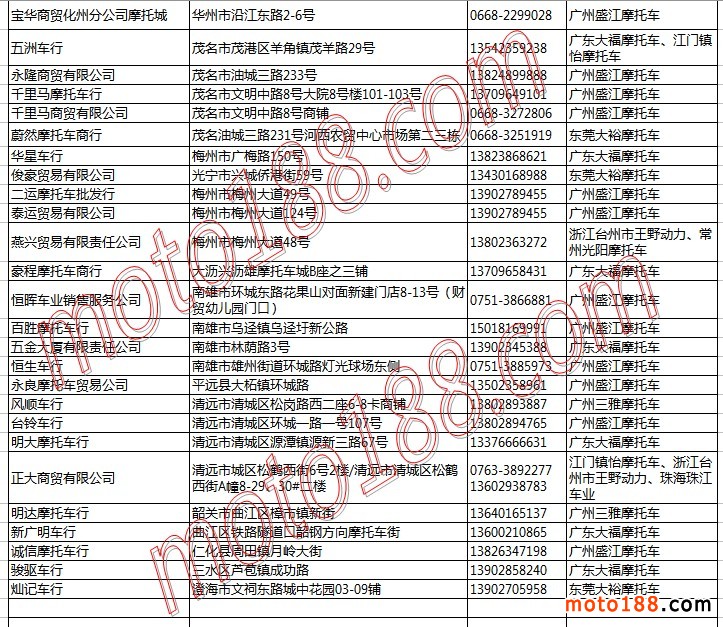廣東省摩托車整車經銷商名錄