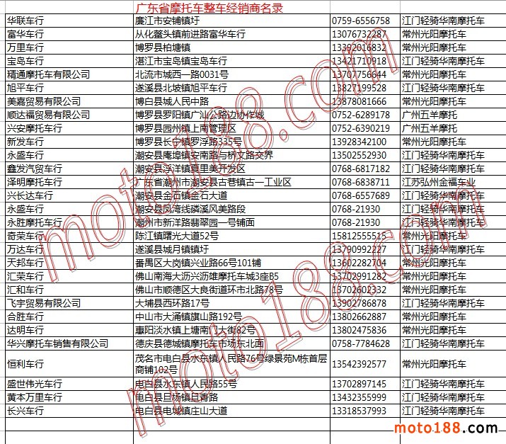 廣東省摩托車整車經銷商名錄