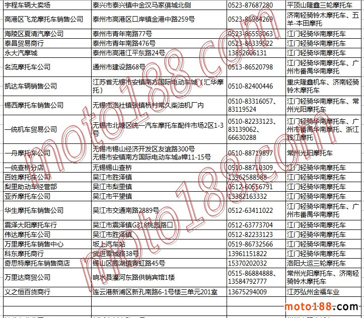 江蘇省摩托車整車經(jīng)銷商名錄