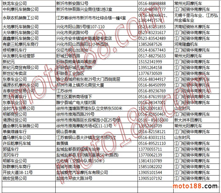 江蘇省摩托車整車經銷商名錄