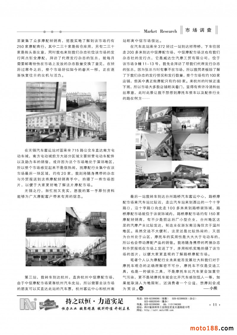 《摩托車與配件》自三月份正式改版后,雜志的    有較大的變化。因為是剛剛推出,市場還有一個適應時期,尤其一些市場人士有顧慮,擔心頻率加快以后廣告的留存期縮短,還有擔心印刷量會下降。為了慎重起見,我們雜志社在春運一結束后就安排部分人員去華東和華南及中南、西南等市場走了一遍。先后去了如皋、無錫、撫順、臺州以及商丘、鄭州、武漢、襄陽、荊州、株洲、長株潭、廣州、重慶、成都等市場,行程在隴海線南邊走了一圈。到市場第一線汲取客戶的意見,了解市場的發行,調整了部分發行點,并新建和恢復了六個發行點,進一步完善市場的發行。雜志改刊后不僅僅是期數的變化,更是一個系統的工作,這涉及到我們服務的提升,整個系統的升級。在這一期雜志內,我們會用一定的篇幅介紹我們所走過的市場的具體狀況。目前我們是行業長期調整以來僅存的專業媒體,一方面我們面臨市場的風險,如果不努力我們也會和前面已經淪陷的媒體一樣,被市場拋棄。另一方面來自我們內部及系統內的風險,即我們的管理和服務是否和雜志升級一樣,也在同步提升?我們面臨新的改革發展機會,我們能否把握住、把握好?在進行科學的發展時,不能因為太 太快而摔跤,所以我們雜志在今年的發展目標是:緊跟市場、穩中求進。在外銷市場面臨銷售不暢的現實情況下,如何服務好內需內銷市場,這也是我們和生產型企業共同要探討的課題。通過對市場的走訪,我們有了目標和方向,也有了信心和動力。正因為此,我們三月份推出雙期后所產生的一系列問題,我們都在妥善應對。今年四月份濟南會議,我們會展現我們去冬今春的勞動成果: