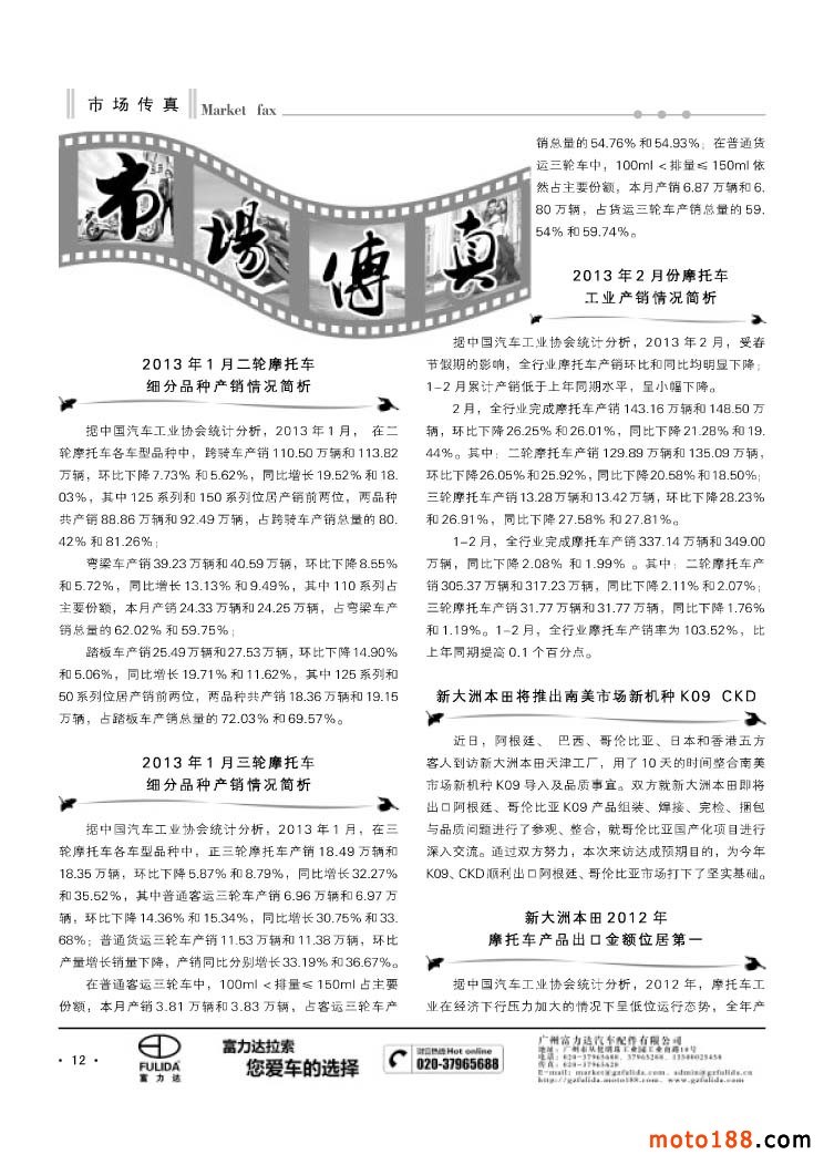 《摩托車與配件》自三月份正式改版后,雜志的    有較大的變化。因為是剛剛推出,市場還有一個適應時期,尤其一些市場人士有顧慮,擔心頻率加快以后廣告的留存期縮短,還有擔心印刷量會下降。為了慎重起見,我們雜志社在春運一結束后就安排部分人員去華東和華南及中南、西南等市場走了一遍。先后去了如皋、無錫、撫順、臺州以及商丘、鄭州、武漢、襄陽、荊州、株洲、長株潭、廣州、重慶、成都等市場,行程在隴海線南邊走了一圈。到市場第一線汲取客戶的意見,了解市場的發行,調整了部分發行點,并新建和恢復了六個發行點,進一步完善市場的發行。雜志改刊后不僅僅是期數的變化,更是一個系統的工作,這涉及到我們服務的提升,整個系統的升級。在這一期雜志內,我們會用一定的篇幅介紹我們所走過的市場的具體狀況。目前我們是行業長期調整以來僅存的專業媒體,一方面我們面臨市場的風險,如果不努力我們也會和前面已經淪陷的媒體一樣,被市場拋棄。另一方面來自我們內部及系統內的風險,即我們的管理和服務是否和雜志升級一樣,也在同步提升?我們面臨新的改革發展機會,我們能否把握住、把握好?在進行科學的發展時,不能因為太 太快而摔跤,所以我們雜志在今年的發展目標是:緊跟市場、穩中求進。在外銷市場面臨銷售不暢的現實情況下,如何服務好內需內銷市場,這也是我們和生產型企業共同要探討的課題。通過對市場的走訪,我們有了目標和方向,也有了信心和動力。正因為此,我們三月份推出雙期后所產生的一系列問題,我們都在妥善應對。今年四月份濟南會議,我們會展現我們去冬今春的勞動成果: