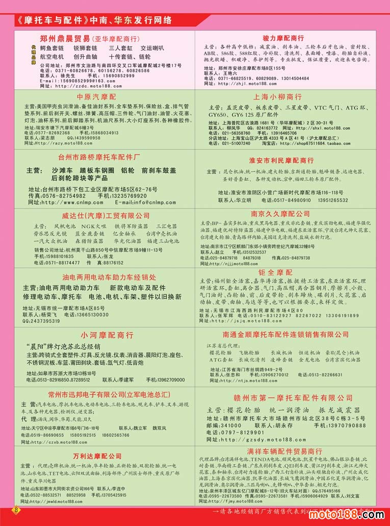 3、《中國摩托車配件生產企業大全(網址總匯)》第十一次升級版,在會上及各大市場同時發送。全國大市場還會送書上門,沒參會的企業可在門上坐等,愿意付郵費(快遞到付也可)的企業我們都會快遞送達。