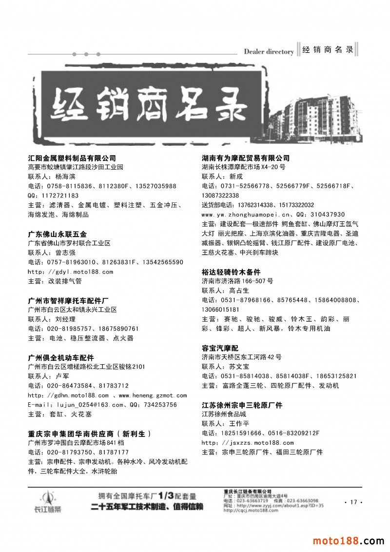 3、《中國摩托車配件生產(chǎn)企業(yè)大全(網(wǎng)址總匯)》第十一次升級版,在會上及各大市場同時發(fā)送。全國大市場還會送書上門,沒參會的企業(yè)可在門上坐等,愿意付郵費(快遞到付也可)的企業(yè)我們都會快遞送達。