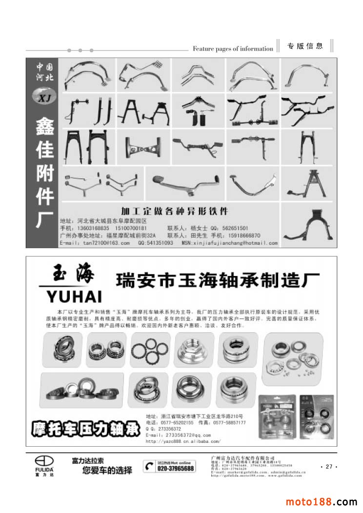 3、《中國摩托車配件生產企業大全(網址總匯)》第十一次升級版,在會上及各大市場同時發送。全國大市場還會送書上門,沒參會的企業可在門上坐等,愿意付郵費(快遞到付也可)的企業我們都會快遞送達。