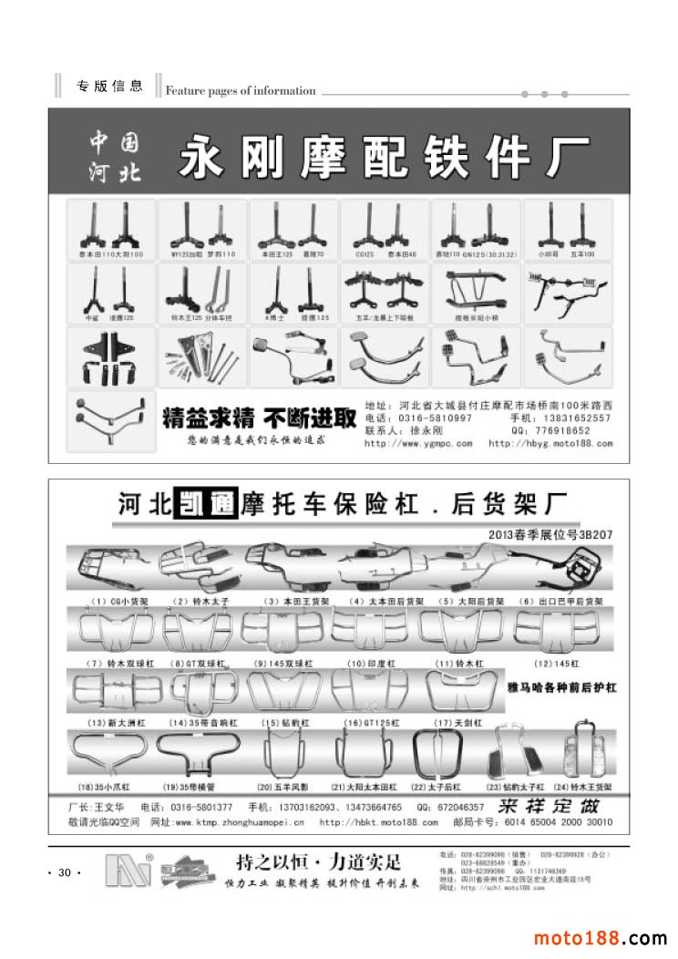 3、《中國摩托車配件生產企業大全(網址總匯)》第十一次升級版,在會上及各大市場同時發送。全國大市場還會送書上門,沒參會的企業可在門上坐等,愿意付郵費(快遞到付也可)的企業我們都會快遞送達。