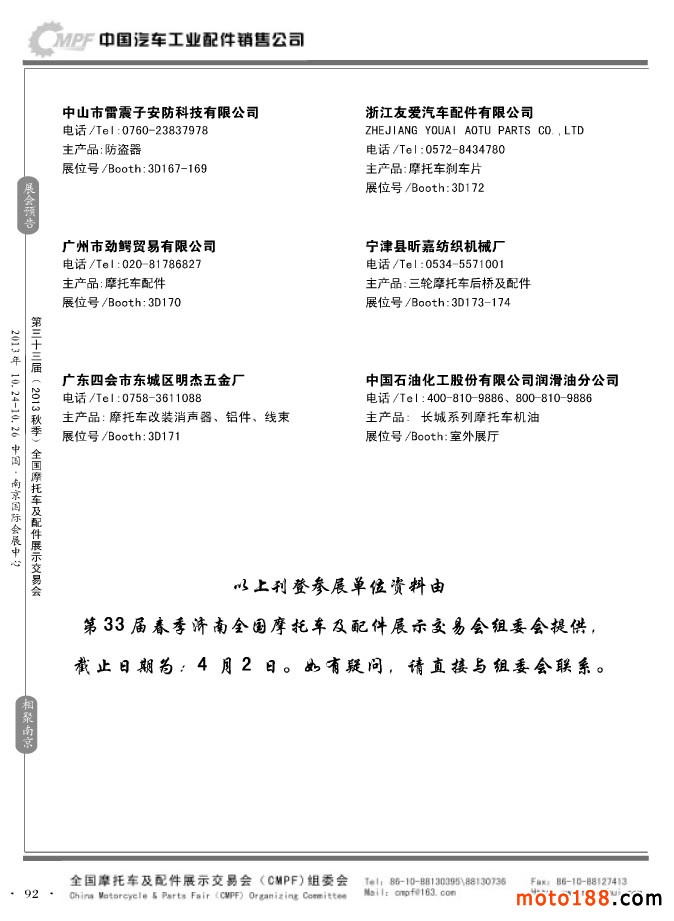 第33屆春季(濟(jì)南)全國摩托車及配件展示交易會參展企業(yè)名錄