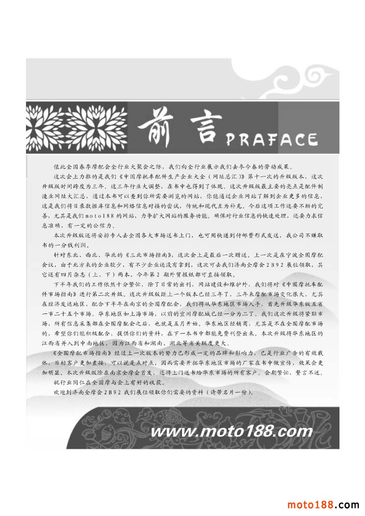 這次會上力推的是我們《中國摩托車配件生產企業大全(網址總匯)》第十一次的升級版本,這次升級版時間跨度為三年。這三年行業大調整,在書中也得到了體現。這次升級版最主要的亮點是配件制造業網址大匯總,通過本書可以查到你所需要瀏覽的網站,你能通過企業網站了解到企業更多的信息,這是我們將目錄數據庫信息和網絡信息對接的嘗試,傳統和現代互為補充。今后這項工作還要不斷的完善,尤其是我們moto188的網站,力爭擴大網站的服務功能。確保對行業信息的快速處理,還要力求信息準確,有一定的公信力。