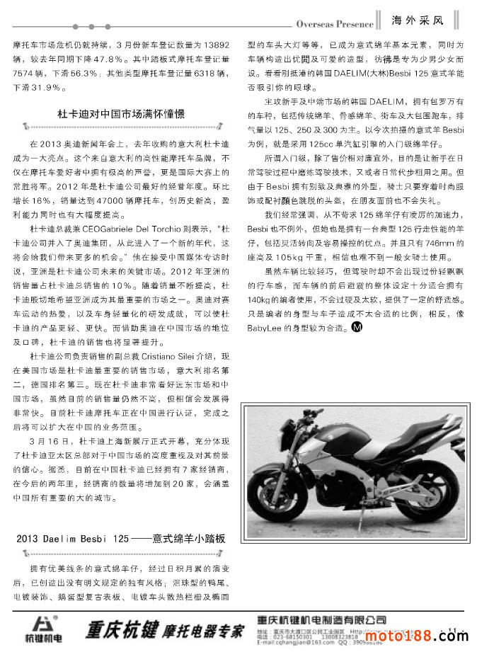 目前行業只有我們是碩果僅存的媒體,全國有七十幾個大大小小的集散市場,和分散在各地市、縣、鎮的幾萬家經營散戶。姑且不算國外市場,就國內摩配行業而言也算是。經過這么多年的調整,都先后轉向了,如果一年出十二期雜志,對于整個摩配行業來說確實是不夠的:周期長、時效性慢,不符合未來市場的需要。當然,這需要一個適應的過程,我們現在決定冬夏季各縮一期,讓節奏適應市場。這兩年來我們雜志每年都有一些調整,來適應市場的變化。不變是相對的,變是永恒的,尤其像《摩托車與配件》在上升和發展時期,更是在探索中前進,在前進中發展。那些倒下的媒體就是因為缺少創新探索精神,墨守成規,與社會發展趨勢漸行漸遠而被時代所淘汰。