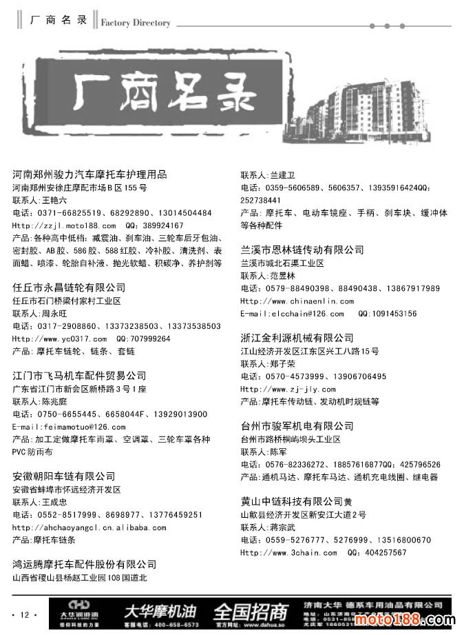 目前行業只有我們是碩果僅存的媒體,全國有七十幾個大大小小的集散市場,和分散在各地市、縣、鎮的幾萬家經營散戶。姑且不算國外市場,就國內摩配行業而言也算是。經過這么多年的調整,都先后轉向了,如果一年出十二期雜志,對于整個摩配行業來說確實是不夠的:周期長、時效性慢,不符合未來市場的需要。當然,這需要一個適應的過程,我們現在決定冬夏季各縮一期,讓節奏適應市場。這兩年來我們雜志每年都有一些調整,來適應市場的變化。不變是相對的,變是永恒的,尤其像《摩托車與配件》在上升和發展時期,更是在探索中前進,在前進中發展。那些倒下的媒體就是因為缺少創新探索精神,墨守成規,與社會發展趨勢漸行漸遠而被時代所淘汰。