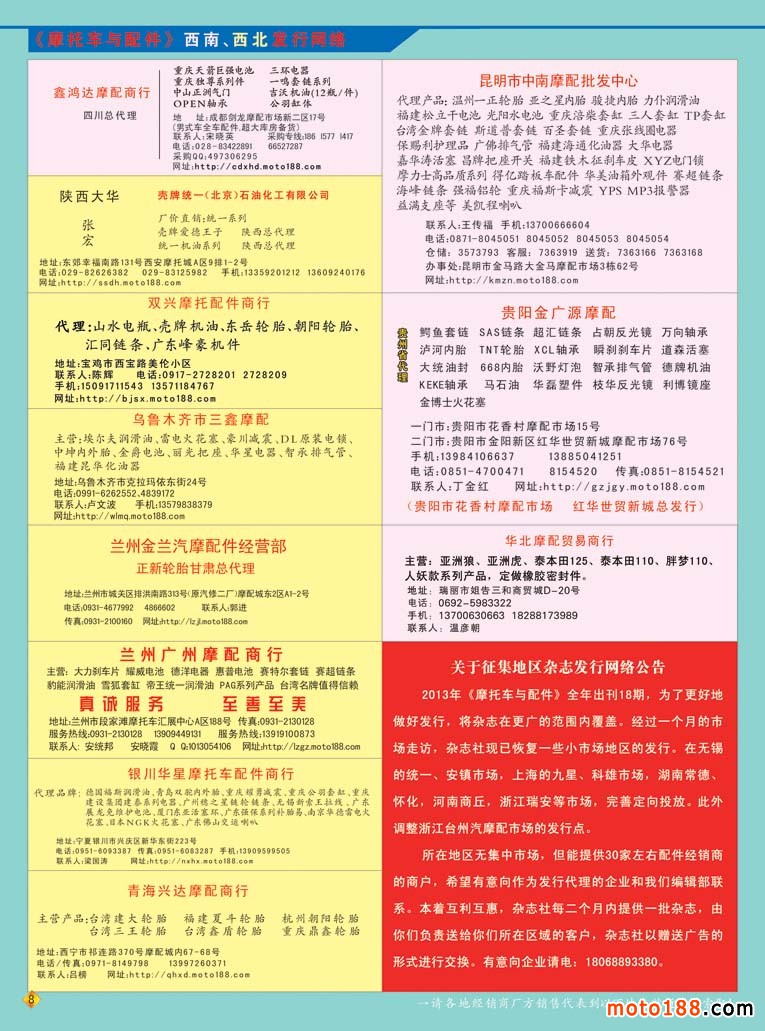 在4月29日全摩會(huì)結(jié)束之后,也有兩個(gè)與行業(yè)有關(guān)的會(huì)議,即5月6日的第23屆中國(guó)國(guó)際自行車(chē)展覽暨2013年中國(guó)國(guó)際摩托車(chē)及零部件交易會(huì)在上海新國(guó)際展覽中心召開(kāi)。這次會(huì)議是以自行車(chē)及配件唱主角,電動(dòng)車(chē)和摩托車(chē)作為配角而舉辦的大型會(huì)議,這次會(huì)議在自行車(chē)行業(yè)是規(guī)模最大的會(huì)議。與我們摩托車(chē)行業(yè)有關(guān)的一些從事外貿(mào)的整車(chē)廠,如建設(shè)、錢(qián)江等四五家廠家在附展館有一專(zhuān)門(mén)展廳。另外,輪胎企業(yè)有一個(gè)專(zhuān)門(mén)的展館,展品是外胎和內(nèi)胎。其中外胎來(lái)的大廠較多,也較全,比如正新、建大、朝陽(yáng),國(guó)內(nèi)有影響力的都基本來(lái)參會(huì)了,是這次會(huì)議的亮點(diǎn)。上海會(huì)議結(jié)束后,我們帶了部分外貿(mào)報(bào)紙和雜志在上海幾個(gè)市場(chǎng)進(jìn)行了發(fā)放,同時(shí)走訪了這些市場(chǎng)。自去年上半年,宜川市場(chǎng)拆遷后,在古浪路和滬太路分別形成了兩個(gè)市場(chǎng)。我們?nèi)チ嗣恳患疑虘?hù),收集市場(chǎng)客戶(hù)資料,為我們今年下半年《華東市場(chǎng)指南》的出版進(jìn)行準(zhǔn)備。這兩個(gè)市場(chǎng)都不算大,每一個(gè)市場(chǎng)有六七十戶(hù)做摩配生意的,有不少商家就是從宜川市場(chǎng)搬來(lái)的。還有兩個(gè)小市場(chǎng),科雄和星中路市場(chǎng),商戶(hù)比年初又有減少,市場(chǎng)明顯在萎縮。我們這次的《華東市場(chǎng)指南升級(jí)版》原準(zhǔn)備將江西不收錄其中,準(zhǔn)備和中南地區(qū)一起編入,但如果華東市場(chǎng)萎縮輻度較大,江西省還將編入華東地區(qū)。