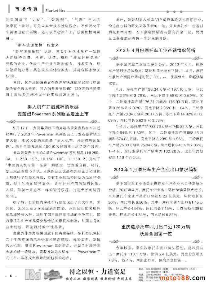 時節(jié)即將進入盛夏了,南方的天氣也越來越熱,國內(nèi)的內(nèi)銷市場,尤其是南方地區(qū)的市場將轉(zhuǎn)成淡季。根據(jù)我們今年的出刊計劃,我們從這個月也就是六月份開始至八月份每月出一期雜志。本期雜志是在六月中旬出刊;7月雜志將在七月上旬出刊,同時在中旬還會出刊今年的第三期《摩托車與配件外貿(mào)報》即夏季版(十月出刊秋季版);八月初出刊8月版;八月底至九月初出刊9月上半期雜志,十月中下旬出刊9月下半期雜志。請大家注意我們的出刊日期,及時 到我們的發(fā)行點領(lǐng)取。我們也會在moto188網(wǎng)站的公告欄及時通知大家雜志發(fā)貨的具體時間。