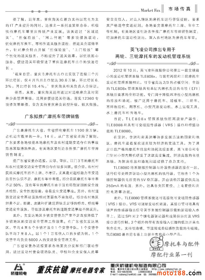時節(jié)即將進入盛夏了,南方的天氣也越來越熱,國內的內銷市場,尤其是南方地區(qū)的市場將轉成淡季。根據(jù)我們今年的出刊計劃,我們從這個月也就是六月份開始至八月份每月出一期雜志。本期雜志是在六月中旬出刊;7月雜志將在七月上旬出刊,同時在中旬還會出刊今年的第三期《摩托車與配件外貿報》即夏季版(十月出刊秋季版);八月初出刊8月版;八月底至九月初出刊9月上半期雜志,十月中下旬出刊9月下半期雜志。請大家注意我們的出刊日期,及時 到我們的發(fā)行點領取。我們也會在moto188網站的公告欄及時通知大家雜志發(fā)貨的具體時間。