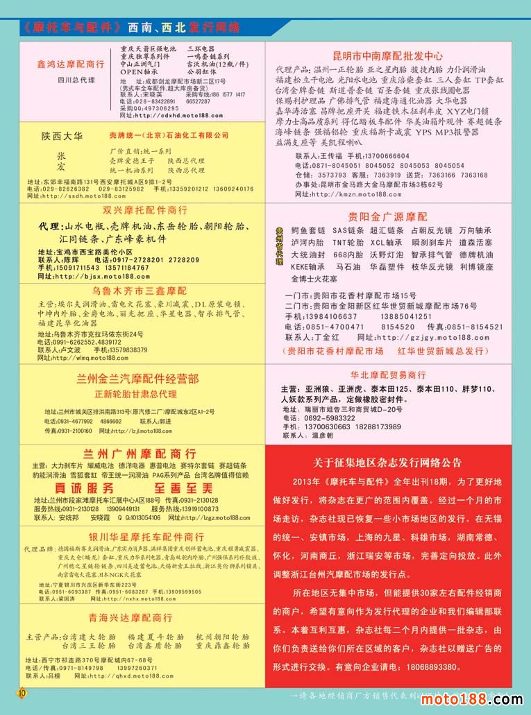 在這個淡季里,我們還將去西北和東北送書、送報上萬,走訪調(diào)研這些地區(qū)的市場。再次強調(diào),我們送的書是今年上半年在濟南全摩會首發(fā)的新版《中國摩托車配件生產(chǎn)企業(yè)大全》,送的報紙是《摩托車與配件外貿(mào)報》。我們的雜志還是由全國各發(fā)行點直接發(fā)放給市場上的經(jīng)營商戶。目前《大全》已完成在山東、河北、廣東和重慶等省市的主要市場的發(fā)行。今年年底之前完成對全國市場的投放。