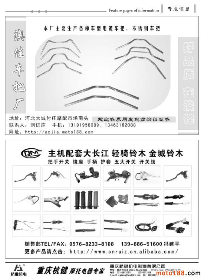 經過幾次改刊后的發行情況來看,我們這種根據市場變化靈活出刊的形式逐步被企業所認可。在發行上我們也是沒有打折扣,月出刊兩期后,黑白的內容要比過去豐富得多,可讀性也在增強。六月變單期后,我們另增加8頁黑白的文字信息內容,黑白每期為40頁。由于北方市場和南方市場淡旺季同期相反,所以在南方的淡季里,我們雜志在北方市場的發行數量將增加。不管南北市場淡旺不同,對我們來說,我們仍將一如既往地做好我們的工作。從今年6月份開始,我們工作人員將分別去福建、浙江、安徽和江西四省,走訪調研這四省的摩配市場,并將派送上萬份《外貿報》和工具書《配件生產企業大全》。同時,我們還將收集市場的最新資料,為下半年的《華東市場指南》做出書的準備工作。目前這項工作進展順利,廣告征集也在穩步進行。完成這些省份的調研工作,我們的信息采集工作也就到了收官階段。工作進展快的話,我們就會提前結束這本書的編排。在10月24日的南京全摩會上,大家就可以看到這本書了。