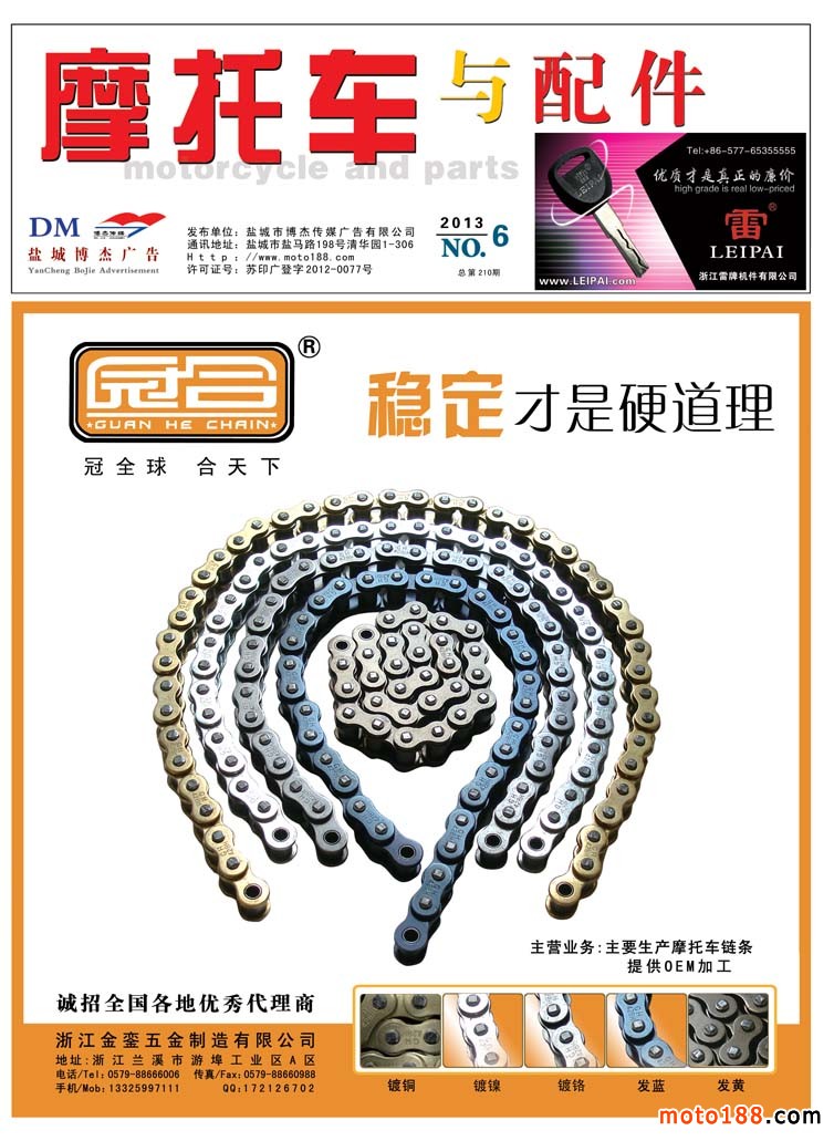 時節即將進入盛夏了,南方的天氣也越來越熱,國內的內銷市場,尤其是南方地區的市場將轉成淡季。根據我們今年的出刊計劃,我們從這個月也就是六月份開始至八月份每月出一期雜志。本期雜志是在六月中旬出刊;7月雜志將在七月上旬出刊,同時在中旬還會出刊今年的第三期《摩托車與配件外貿報》即夏季版(十月出刊秋季版);八月初出刊8月版;八月底至九月初出刊9月上半期雜志,十月中下旬出刊9月下半期雜志。請大家注意我們的出刊日期,及時 到我們的發行點領取。我們也會在moto188網站的公告欄及時通知大家雜志發貨的具體時間。
