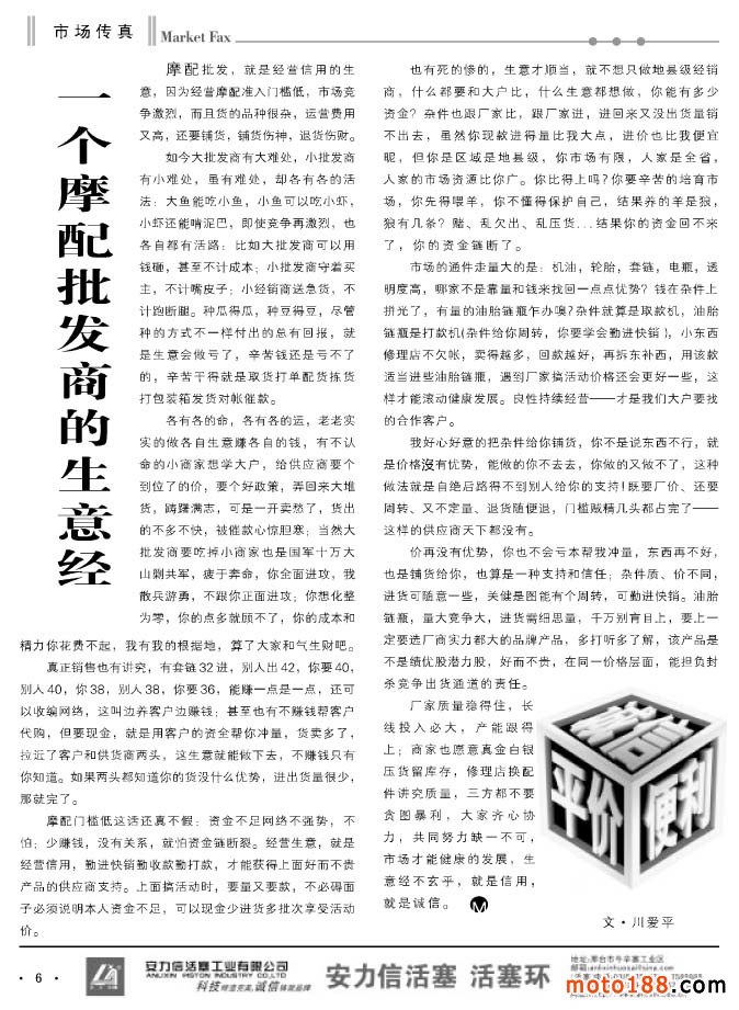 華東市場對我們來說總體感覺是:每況愈下,盡管這樣也有許多優秀的企業,優秀的商戶,他們在還堅持,在千方百計的拓展市場,既是為了生存和發展也是為了一項事業。在物欲橫流、人心浮燥的外部環境下,行業有這樣的守望者,行業也會生生不息、綿延不絕。隨著東部市場淡季的結束,他們也會進入到收獲期。假如你有疑問,那么在十月金秋南京的秋摩會上,你會感受到這份努力的果實,這份執著而帶來的回報。行業的總體盤子在不斷擴大,摩托車后市場的作為也越來越大,這是優勝劣汰的進化過程,進化的結果是強者越強,在困難時候能堅守的必定是未來的成功者。當然那些轉身離開者也未必都全是失敗者,會有新的商機靠他們去捕捉,只要勤勤懇懇、踏踏實實地努力,天道也會酬勤。