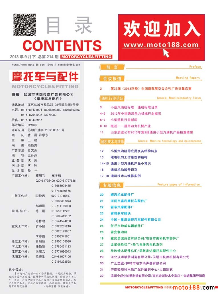 本期《摩托車與配件》雜志為小型汽油機專輯,這似乎與摩托車配件不太相關,但我們還是用心地去組織了與通機行業有關的技術、標準及資訊類的文章。我們編纂這個專輯也是有以下各方面的原因: