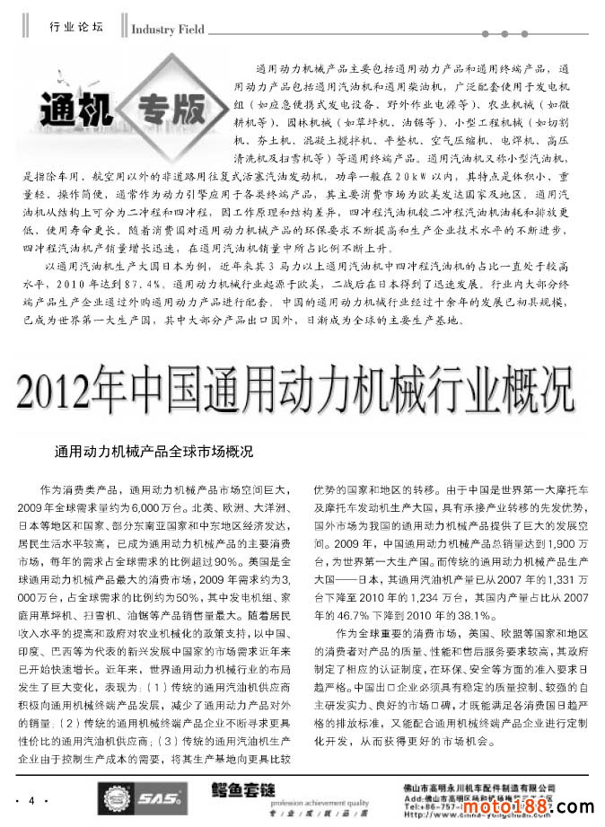 本期《摩托車與配件》雜志為小型汽油機專輯,這似乎與摩托車配件不太相關,但我們還是用心地去組織了與通機行業有關的技術、標準及資訊類的文章。我們編纂這個專輯也是有以下各方面的原因: