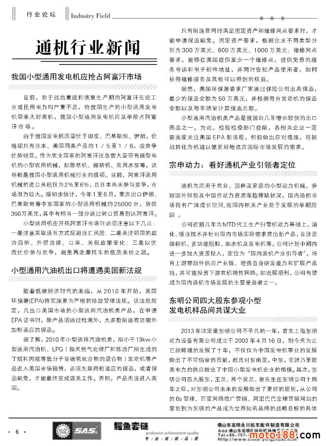 本期《摩托車與配件》雜志為小型汽油機專輯,這似乎與摩托車配件不太相關,但我們還是用心地去組織了與通機行業有關的技術、標準及資訊類的文章。我們編纂這個專輯也是有以下各方面的原因: