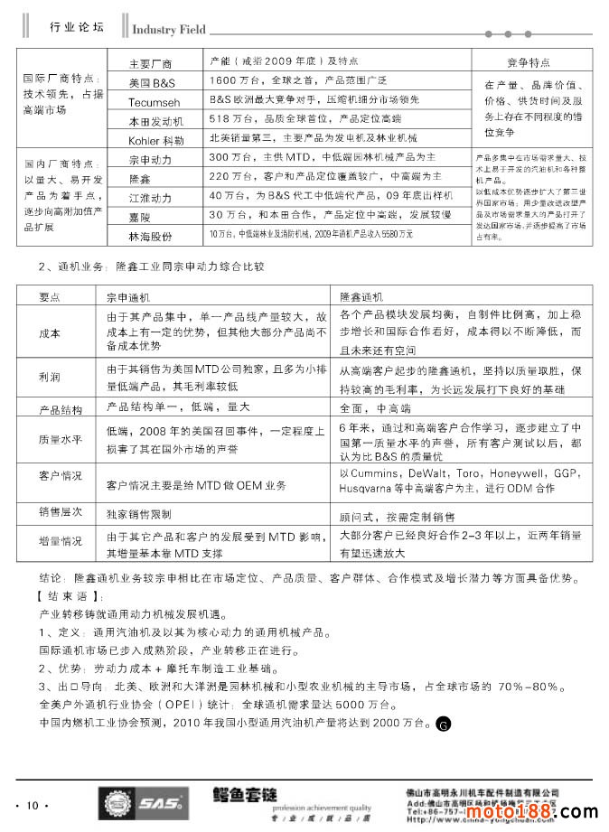 回想這幾年市場的變化,摩托車及配件制造業從造摩托車到部分轉為造電動車。這二年農用三輪摩托車的需求量較大,很快一部分企業轉產三輪車及配件。在通機行業,重慶國營和民營,尤其是民營企業發展神速,有的企業年產量達1-2百萬臺,而且還是以歐美等發達國家市場為主。這讓我們不得不佩服這些企業雖然在市場邊緣中生存,卻還做得風生水起。與通機制造業蒸蒸日上形成反差,通機國內市場才剛剛發育。我們利用去全國市場的機會,也順帶去了一下機電五金等市場。目前在全國還沒有形成完整成形的專業銷售市場,通機部件更是沒成氣候。這為我們摩配市場經營,注入了新的經營項目,豐富了摩配市場的內涵,這是一個新的藍海。這幾年摩托車配件經營利潤越來越薄,市場越來越殘酷,我們向行業提供這樣的信息,希望給企業能有所啟迪,在市場的邊緣開拓市場、發展市場、完善市場。通過這一期的嘗試,我們試水通機市場,以后我們會更加關注這個市場的變化,如能形成一定的國內市場,我們將完善我們的服務形式,用傳統紙媒和網媒來服務于這個市場。