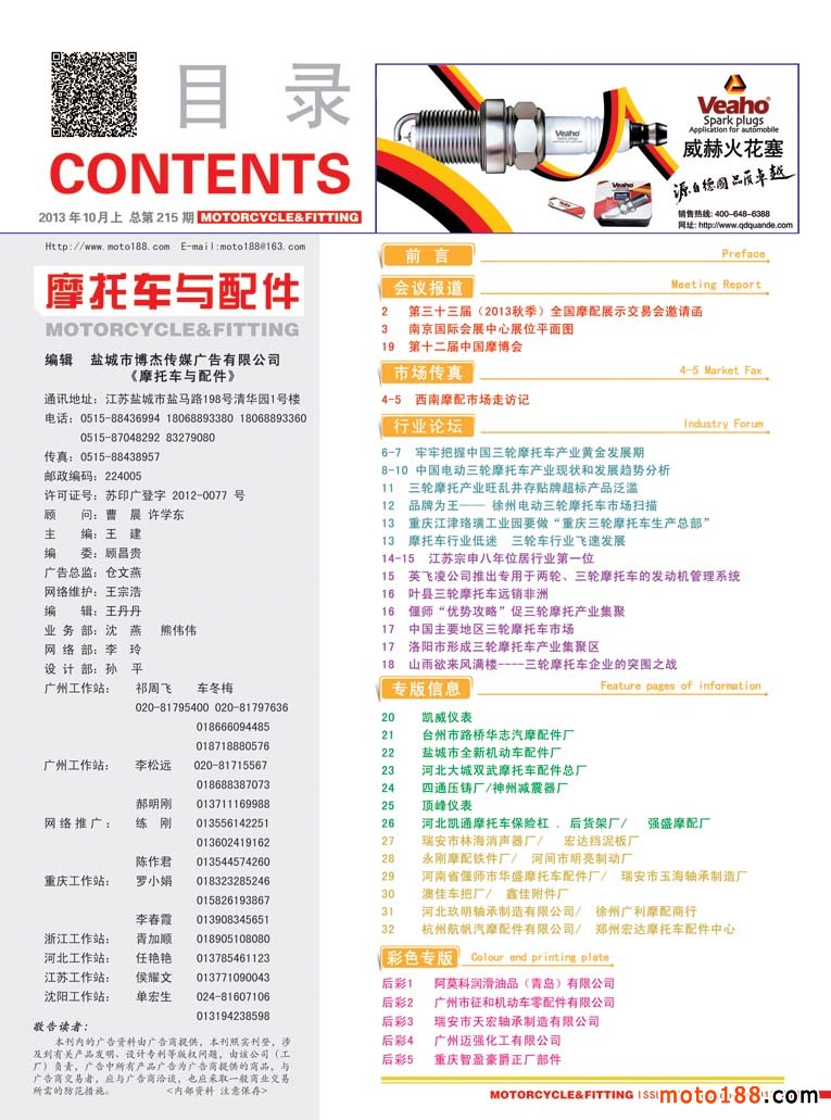 第三十三屆秋季全摩配也將于本月24-26日在南京國際會(huì)展中心召開,這是行業(yè)秋季大點(diǎn)兵。按照組委會(huì)的要求,大會(huì)的會(huì)刊將在本月15日抵達(dá)展館,所以也必須在國慶過后就得送去印刷。在今年秋季南京全摩會(huì),我們還將為參會(huì)企業(yè)和觀展的經(jīng)銷商,贈(zèng)送新版《華東市場(chǎng)指南》,由廣州工作站承制的《廣州市場(chǎng)導(dǎo)購指南》,今年第三期《摩托車與配件外貿(mào)報(bào)》,今年十月上、下期《摩托車與配件》雜志,以及部分庫存書——《中國摩托車配件生產(chǎn)企業(yè)大全》。《配件生產(chǎn)企業(yè)大全》上半年在濟(jì)南首發(fā),目前除湖南、湖北及山西、廣西、河北部分市場(chǎng)沒有發(fā)放外,其余市場(chǎng)基本都是送書上門;還有部分省級(jí)市場(chǎng)由雜志發(fā)行點(diǎn)代理發(fā)送;沒有收到這本書的以及不在摩配市場(chǎng)的企業(yè)請(qǐng)到我們南京展位C89領(lǐng)取;還有《華南、三北、西南》三個(gè)市場(chǎng)的指南,也在會(huì)上發(fā)送。因?yàn)閹齑娴臅欢啵枰@些書的企業(yè)請(qǐng)盡量早去我們展位領(lǐng)取,送完即止。